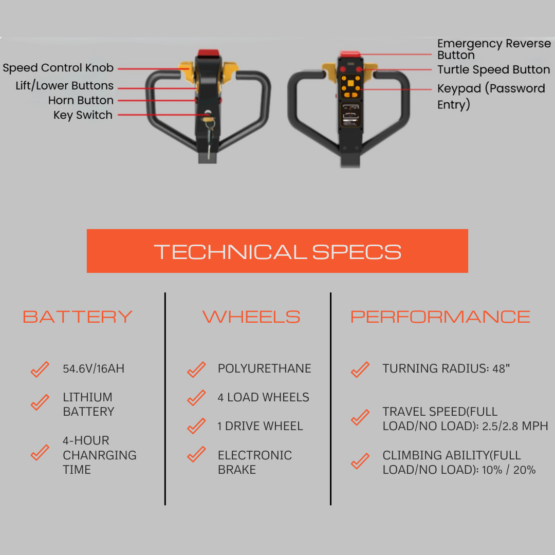 - With a maximum load capacity of 4,400 lbs (2 tons) and a travel speed of up to 2.8 mph, the PT4400W is designed for heavy-duty tasks and rapid material handling, making it an invaluable asset in high-demand environments.